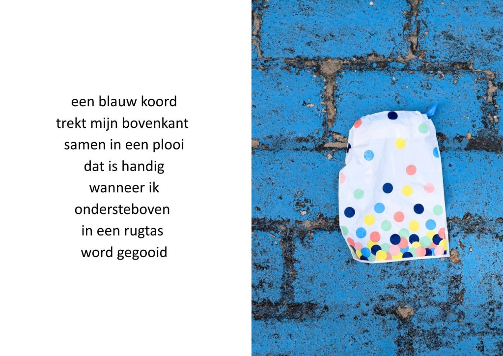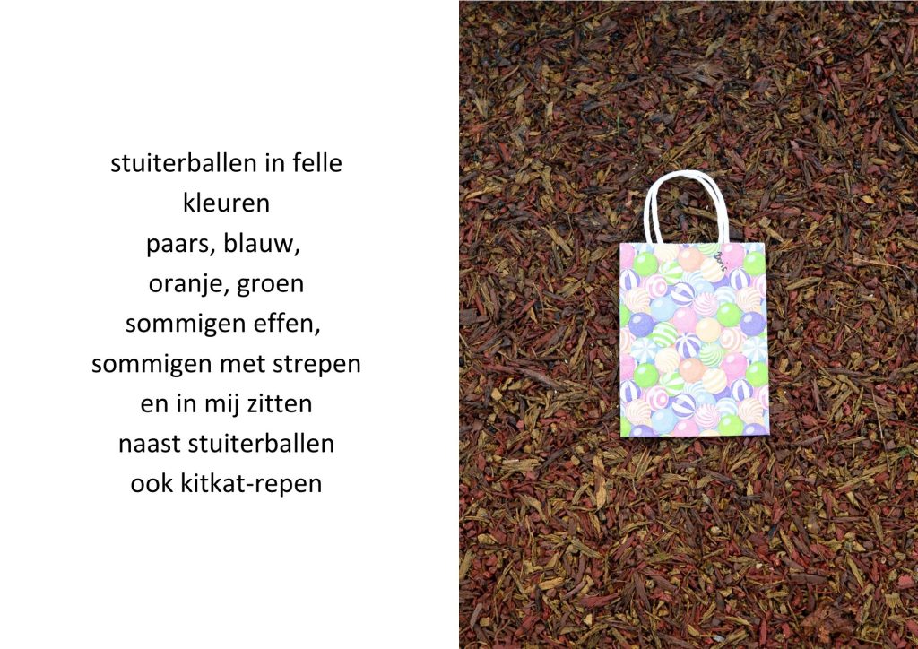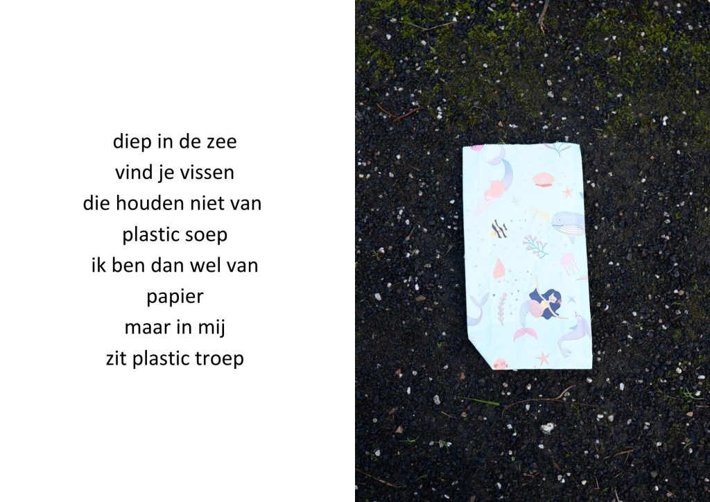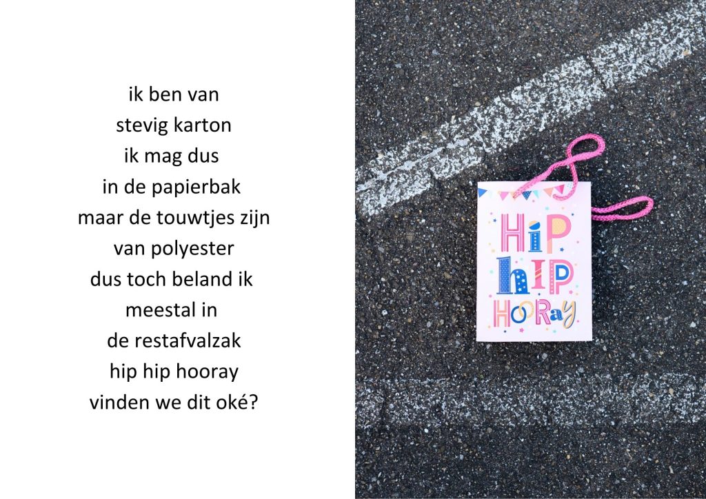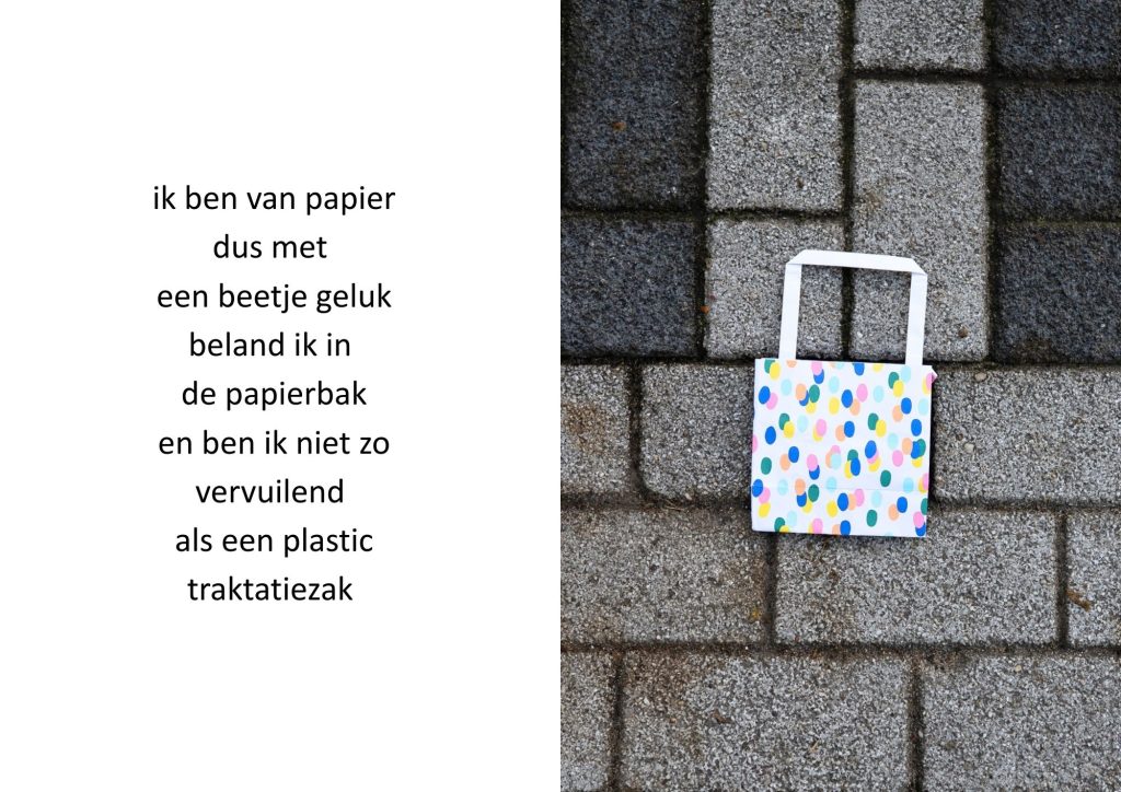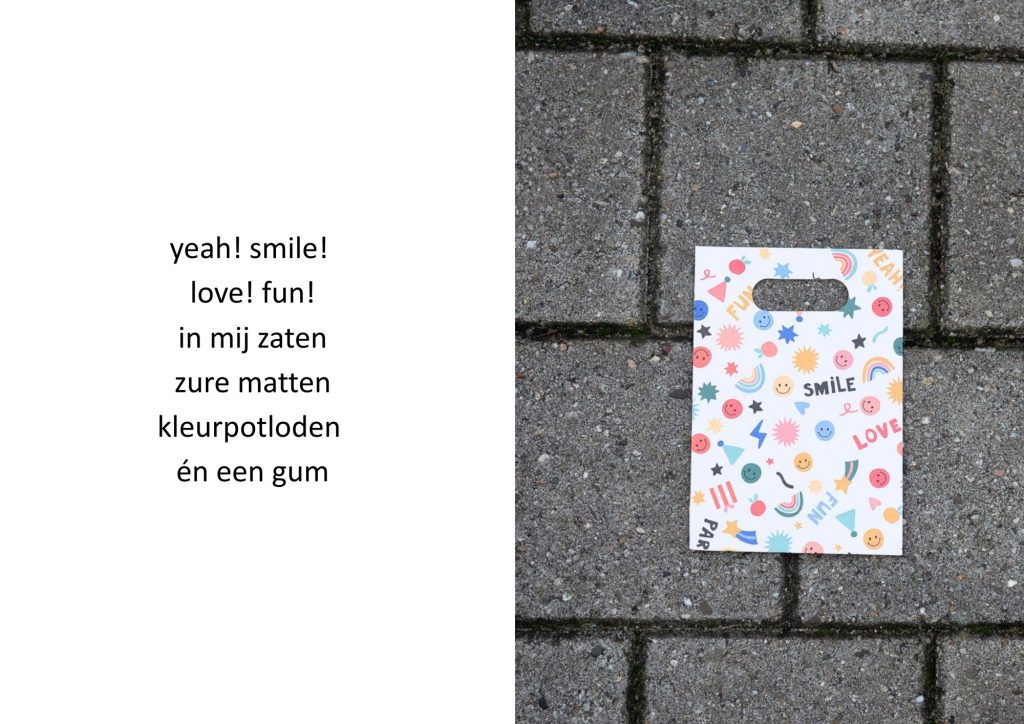 De traktatiezakjes verzamelde ik door de jaren heen wanneer mijn kinderen er weer mee thuiskwamen. De zakjes belandden op een stapel. Wat eerst grappig leek, werd voor mij steeds meer een spiegel van de wegwerpmaatschappij. Ik ging er gedichtjes bij schrijven, om het onderwerp ook een beetje luchtig te houden, in de hoop dat de boodschap daarmee beter aankomt.