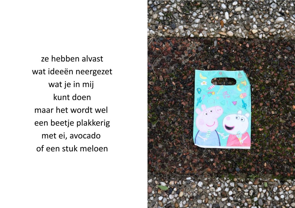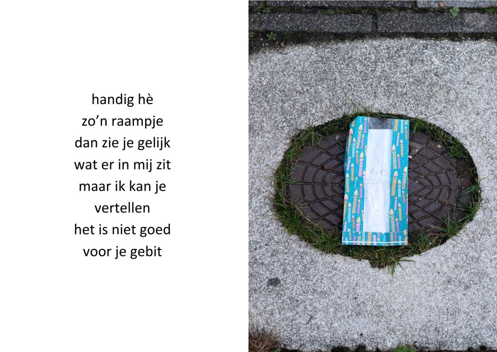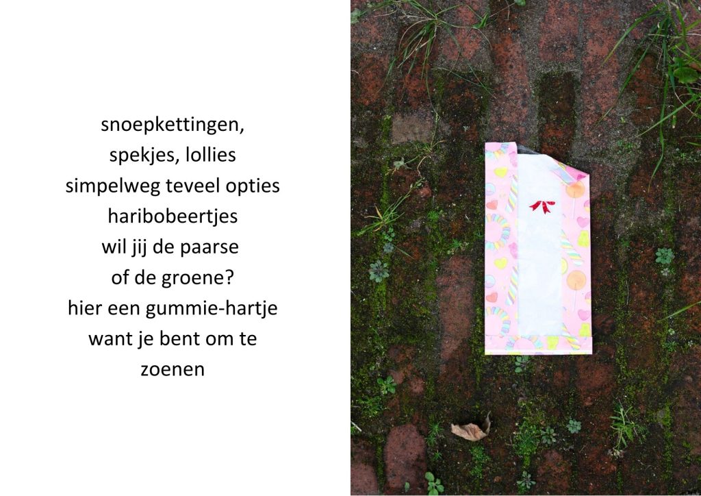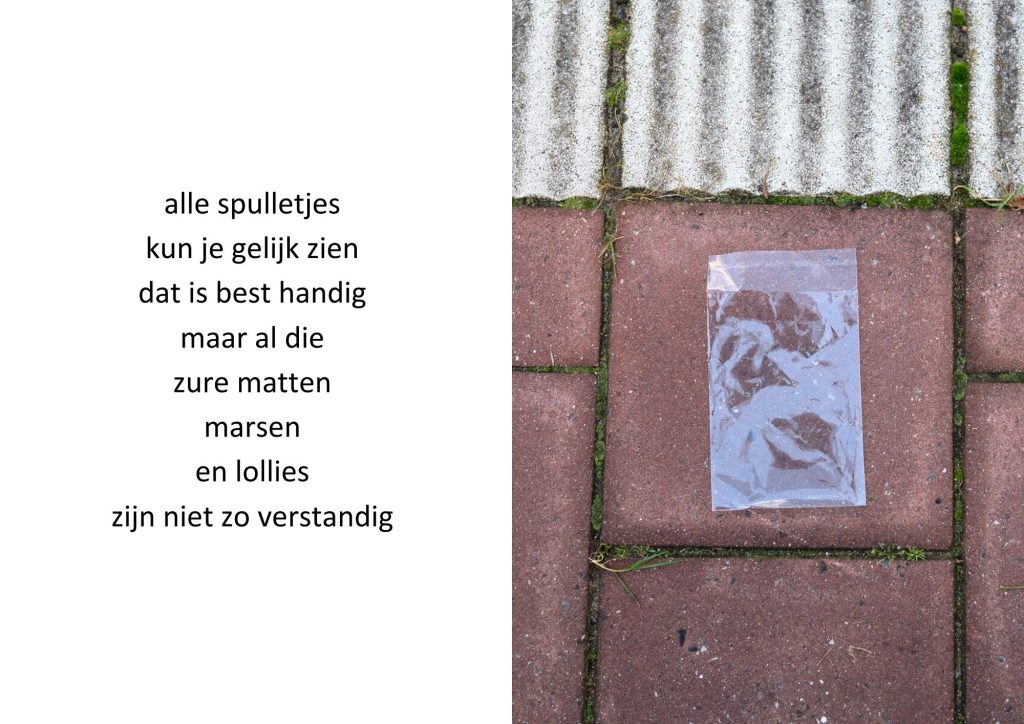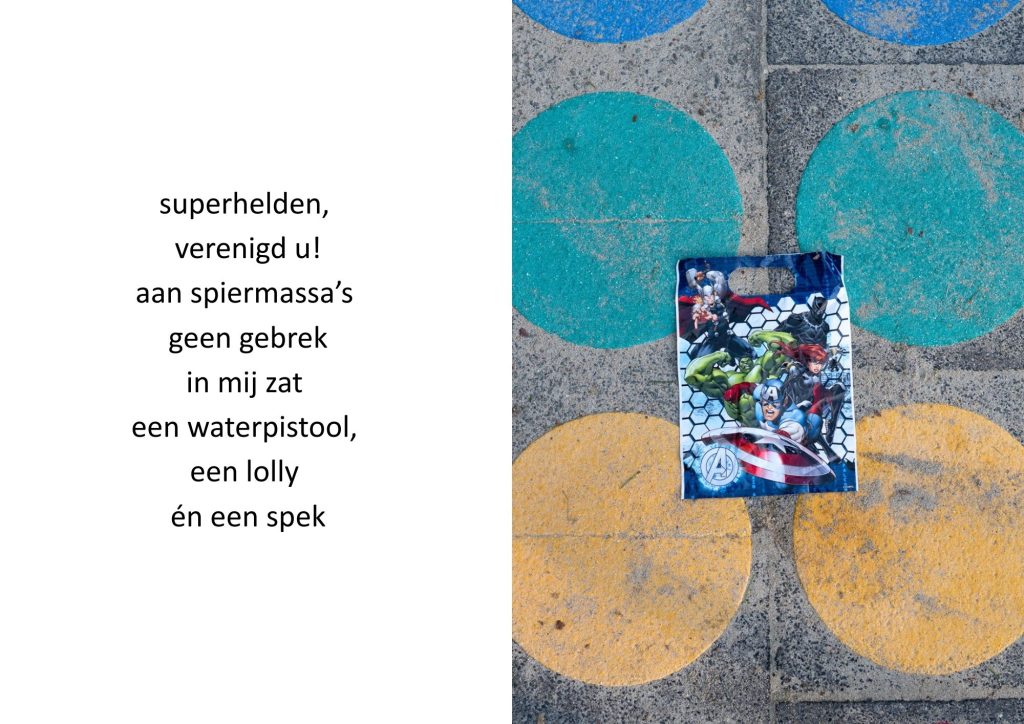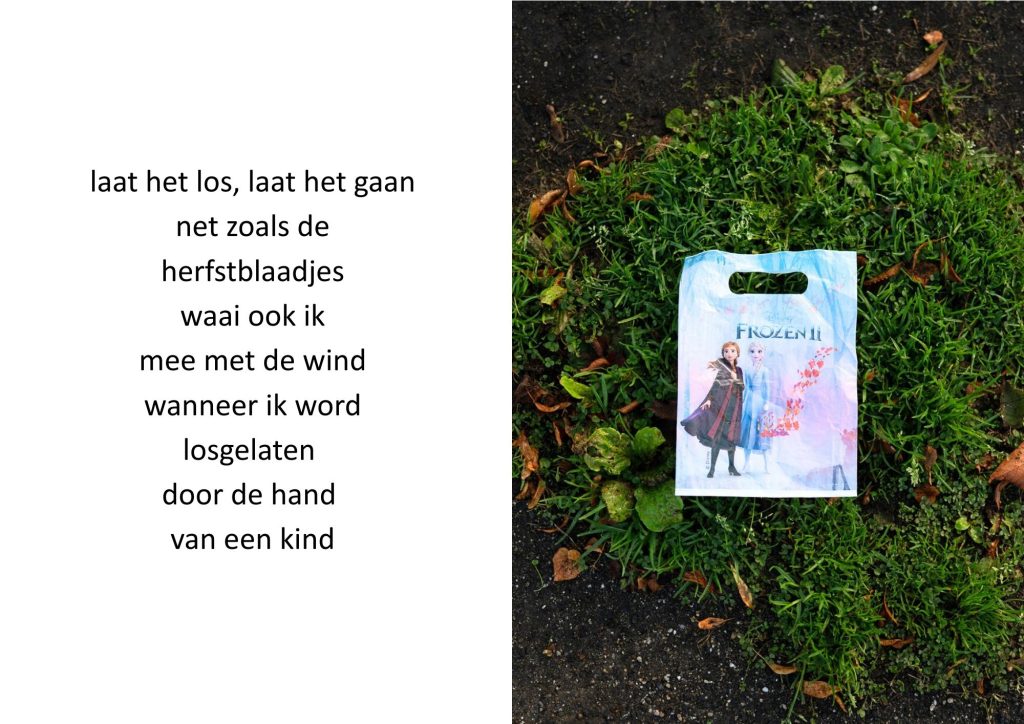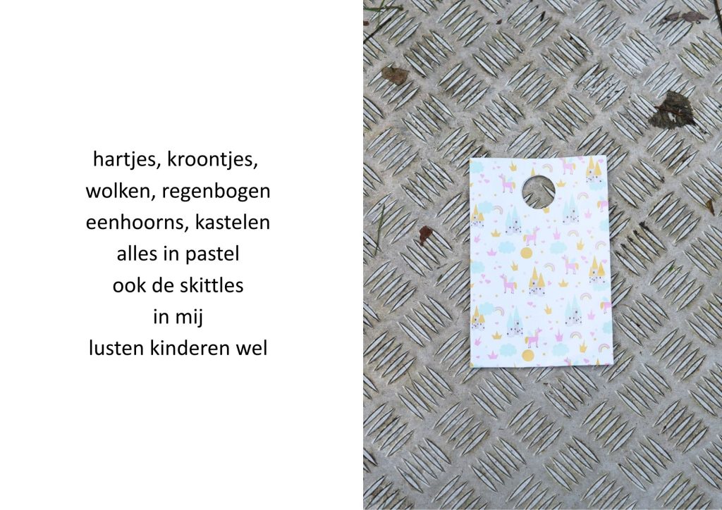 De traktatiezakjes verzamelde ik door de jaren heen wanneer mijn kinderen er weer mee thuiskwamen. De zakjes belandden op een stapel. Wat eerst grappig leek, werd voor mij steeds meer een spiegel van de wegwerpmaatschappij. Ik ging er gedichtjes bij schrijven, om het onderwerp ook een beetje luchtig te houden, in de hoop dat de boodschap daarmee beter aankomt.